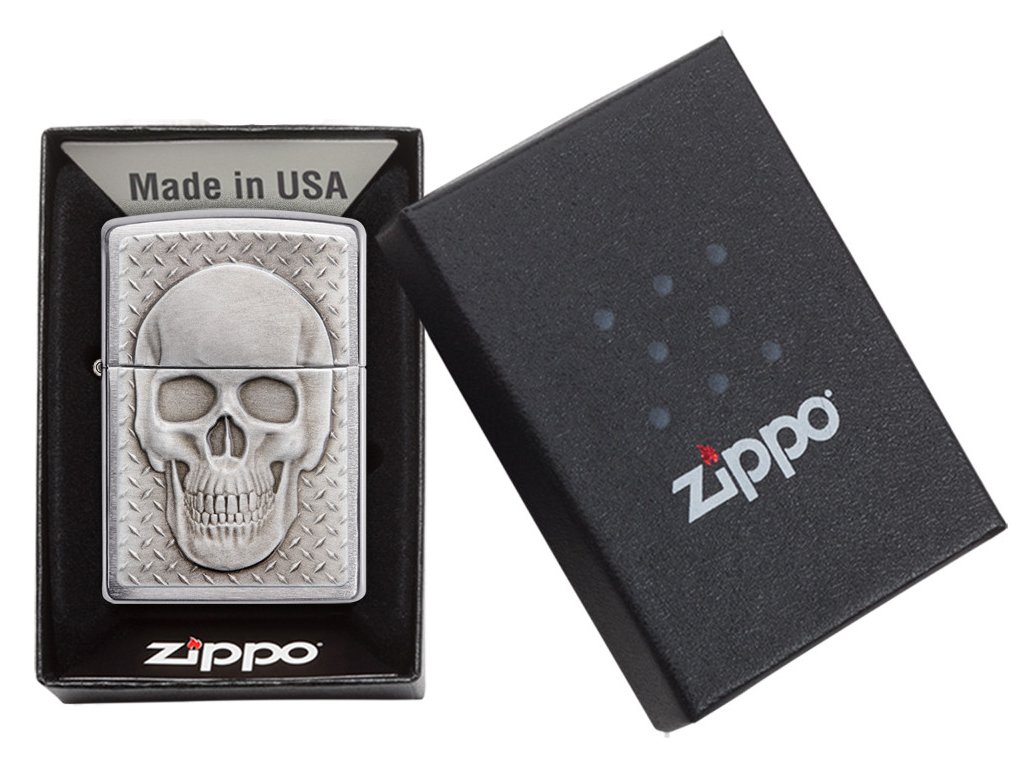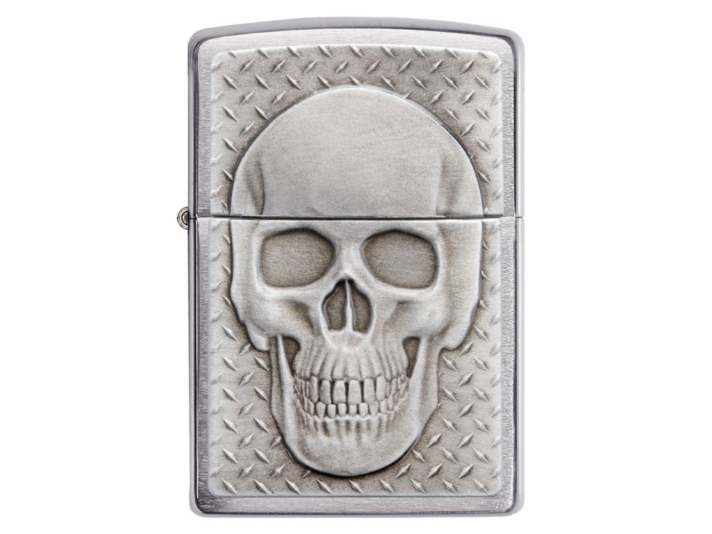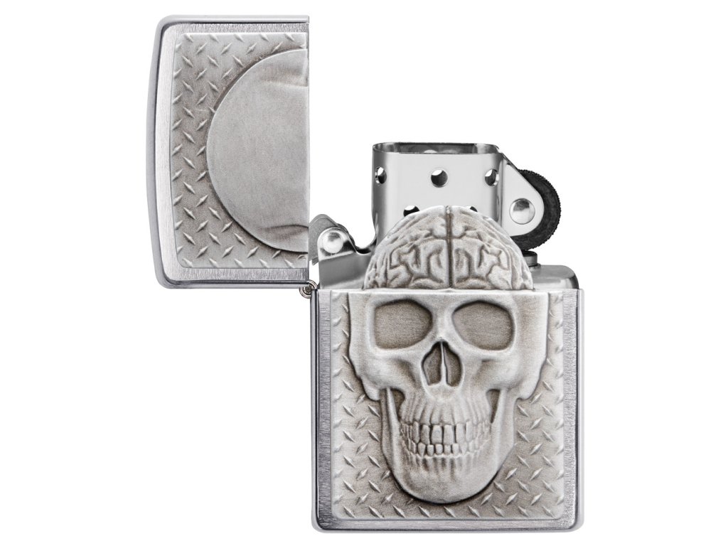 Zapalovač Zippo 21972 Skull with Brain Surprise s povrchem z broušeného chromu.